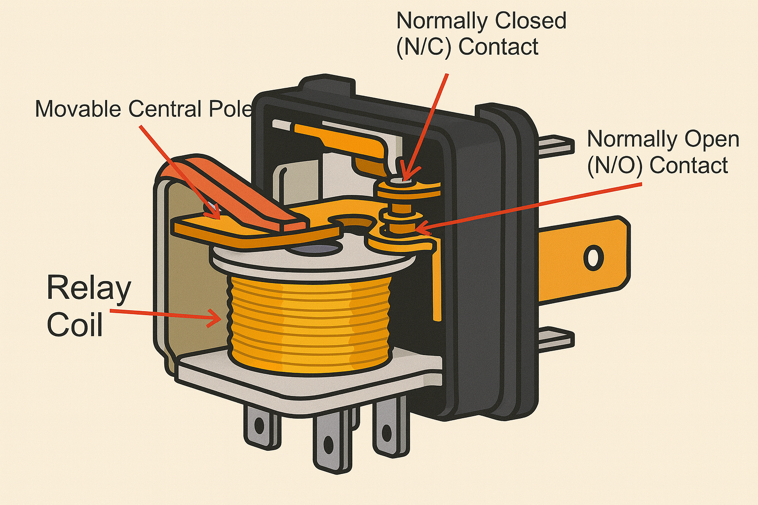 - 원리: 제어 신호가 릴레이의 **코일(Coil)**에 전기를 흘려 전자석을 만들고, 이 자력이 **접점(Contacts)**을 기계적으로 끌어당기거나 밀어 스위치 역할을 수행합니다.